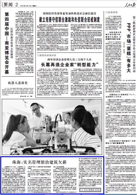 用实名制治理欠薪的方式已在多地先行试点,图为《人民日报》2016年6月报道建筑工地一体化管理平台于2015年4月在珠海市各大建筑工地投入使用,治理欠薪问题取得显著成效。