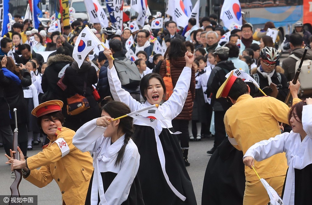 当地时间2017年3月1日,韩国首尔,“三·一独立运动”纪念日当天,活动家扮成二战时期的日本士兵,重现“三·一独立运动”场景。
