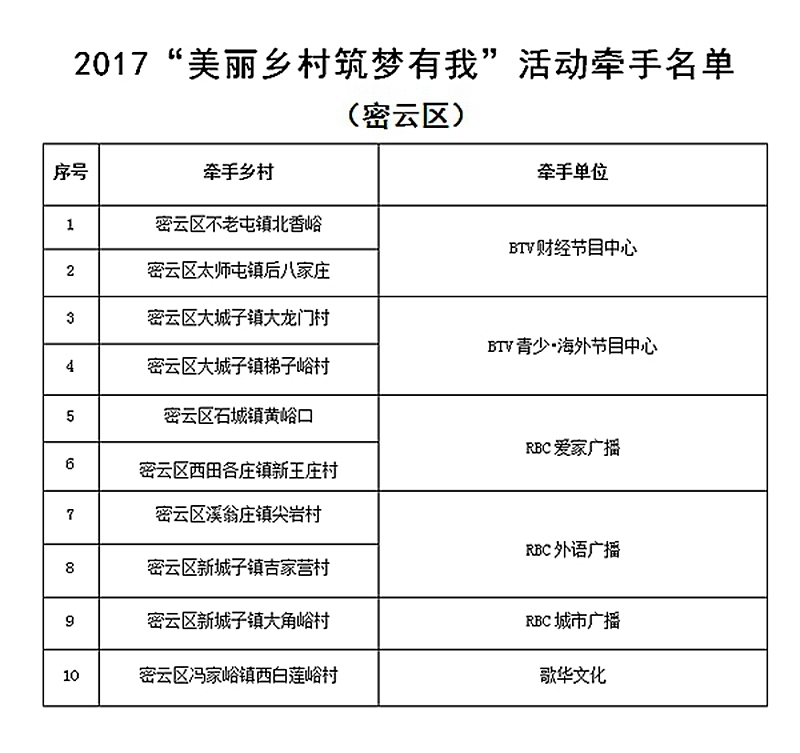 北京广播电视台以所属北京人民广播电台总编室及9个专业台、北京电视台总编室及11个节目中心,北京新媒体集团、以及歌华有线、歌华文化、数字电视、移动电视、地铁电视、城市电视、新新传媒、电视报社等单位为牵手主体,与北京市远郊6个区的50个低收入村牵手结对。