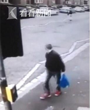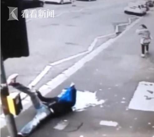 大约六秒钟后,男子重重地撞在街边的交通信号灯灯柱上,摔了个仰面朝天,蓝色塑料袋里的牛奶洒了一地。