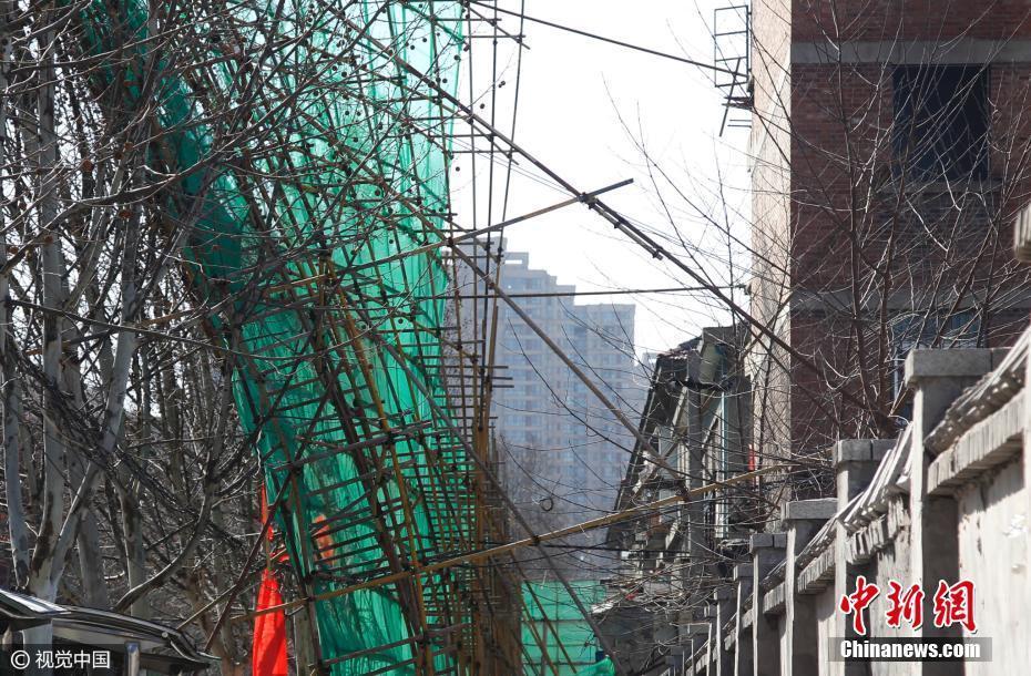 一处临街住宅楼外近20米高的钢铁“脚手架”突遭大风袭击,数十吨重的钢架以及防护网被狂风从楼体上“撕”开,悬在马路半空中。