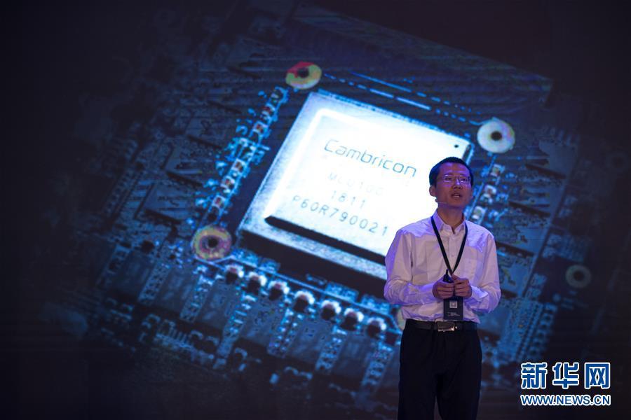 5月3日,在上海国际会议中心举行的发布会上,寒武纪科技公司首席执行官陈天石展示新发布的芯片。当日,中国科学院发布国内首款云端人工智能芯片,理论峰值速度达每秒128万亿次定点运算,达到世界先进水平。 新华社记者金立旺摄