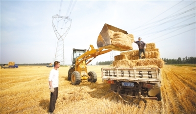 " 三夏"时节,河北不少地方的农民回收麦秸,卖给奶牛场制作饲料。这样不仅避免了焚烧秸秆污染空气,还给农户带来了收入。图为6月15日,在河北省永清县李家口村,农民将压成块的麦秸装车回收。