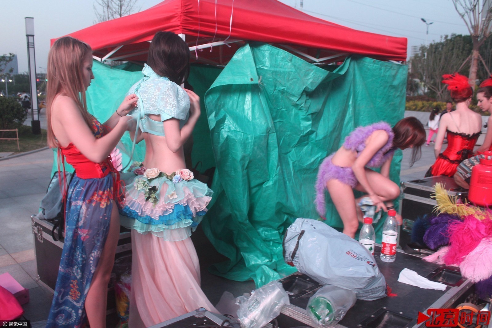 一名洋模刚刚脱下便装时,发现有市民在围观拍照,她便用一口流利的汉语说,“请别拍照,我们在换衣服。”