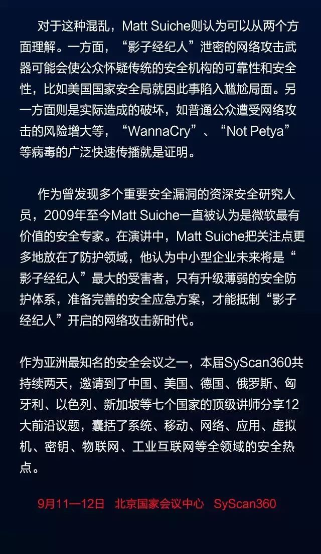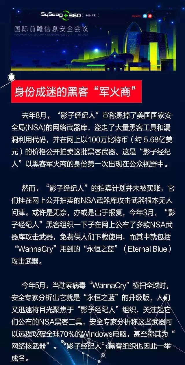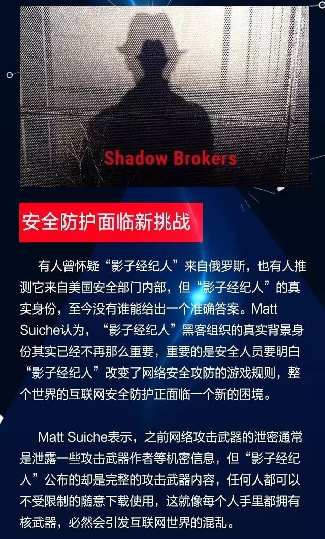 影子经纪人 互联网上的安全游戏 世界著名黑客Matt Suiche今天在SyScan360的讲台上首次揭秘勒索病毒背后元凶--黑客组织影子经纪人的真实面貌。