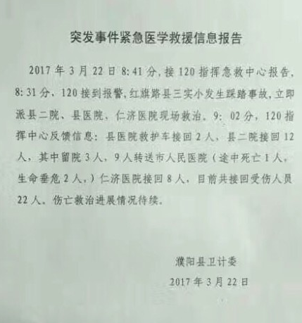 3月22日上午,河南省濮阳县第三实验小学的学生上厕所时发生踩踏事故。