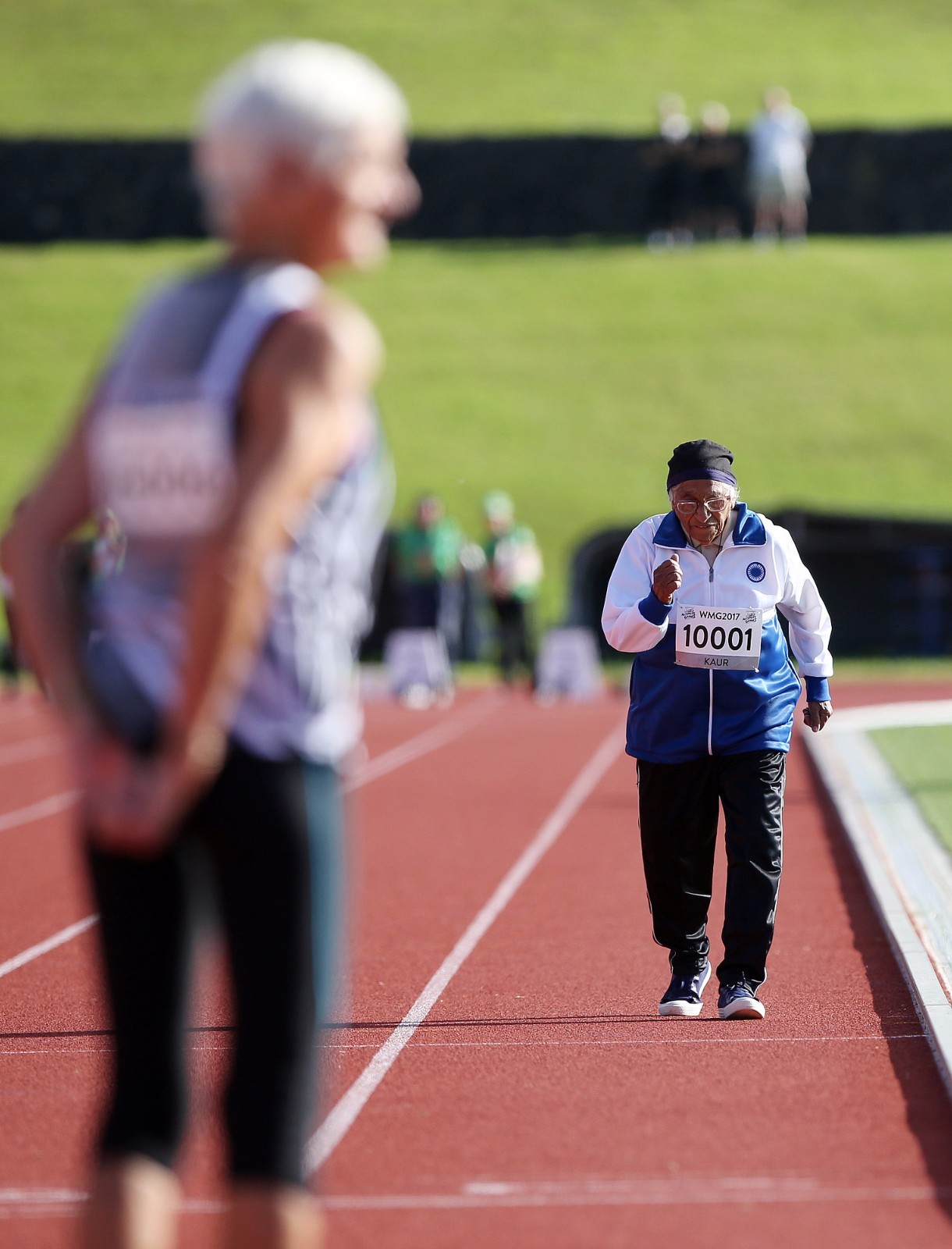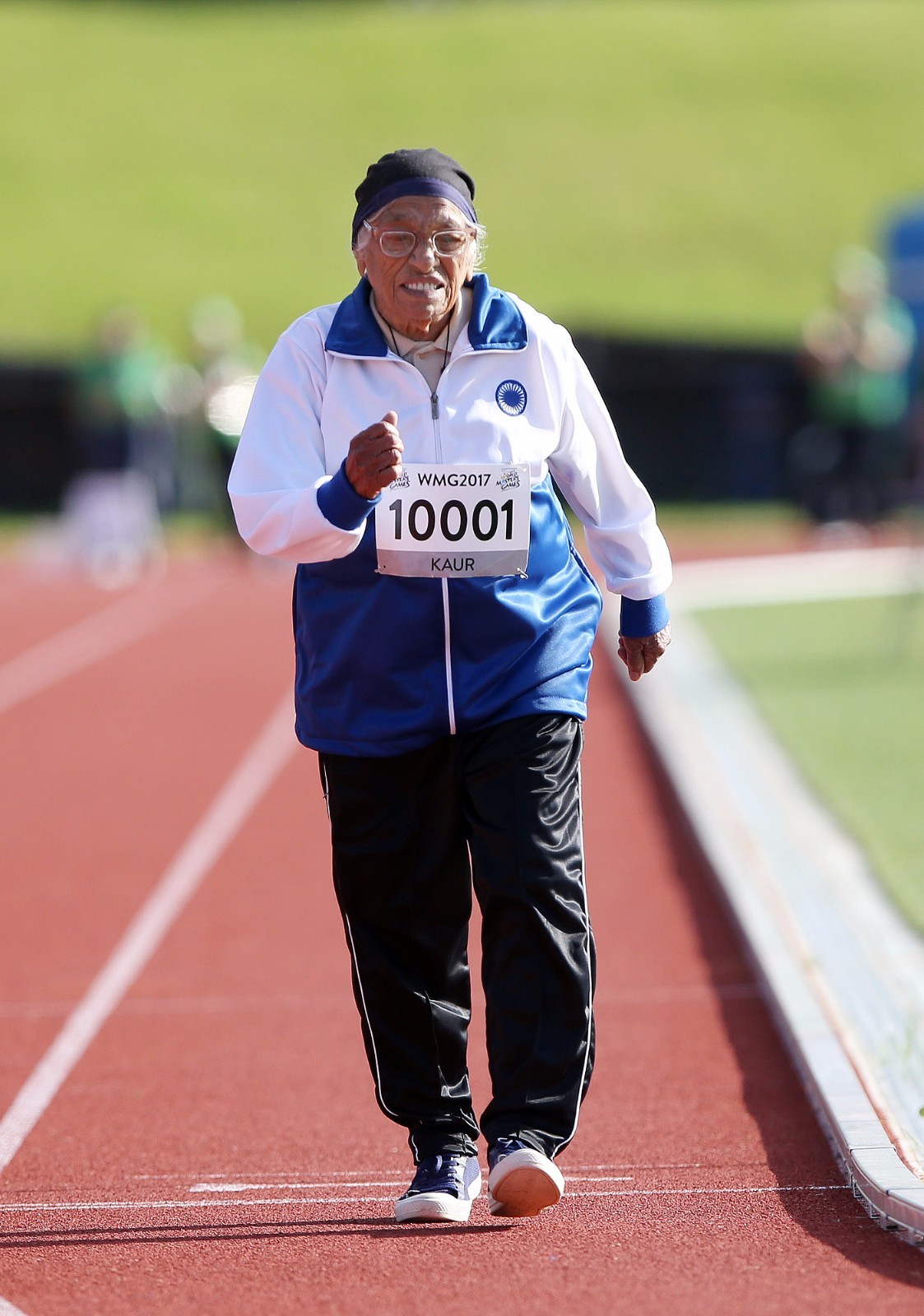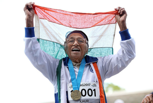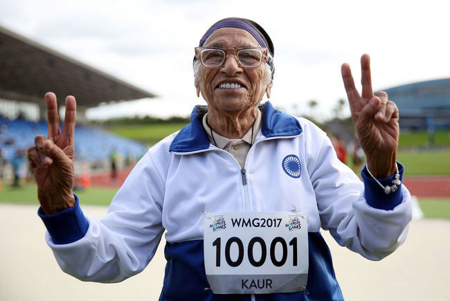 当地时间2017年4月24日,新西兰奥克兰,101岁印度裔老人考尔在世界大师运动会上完成100岁以上组100米跑比赛后庆祝。