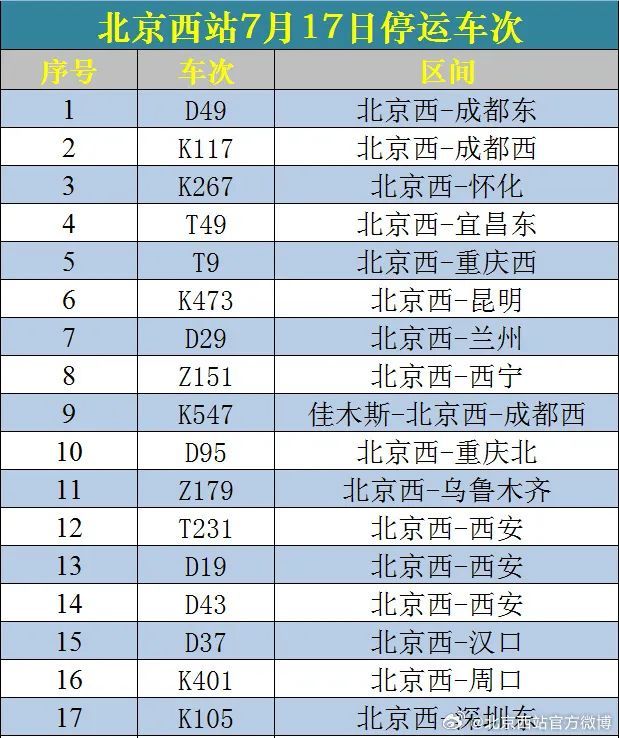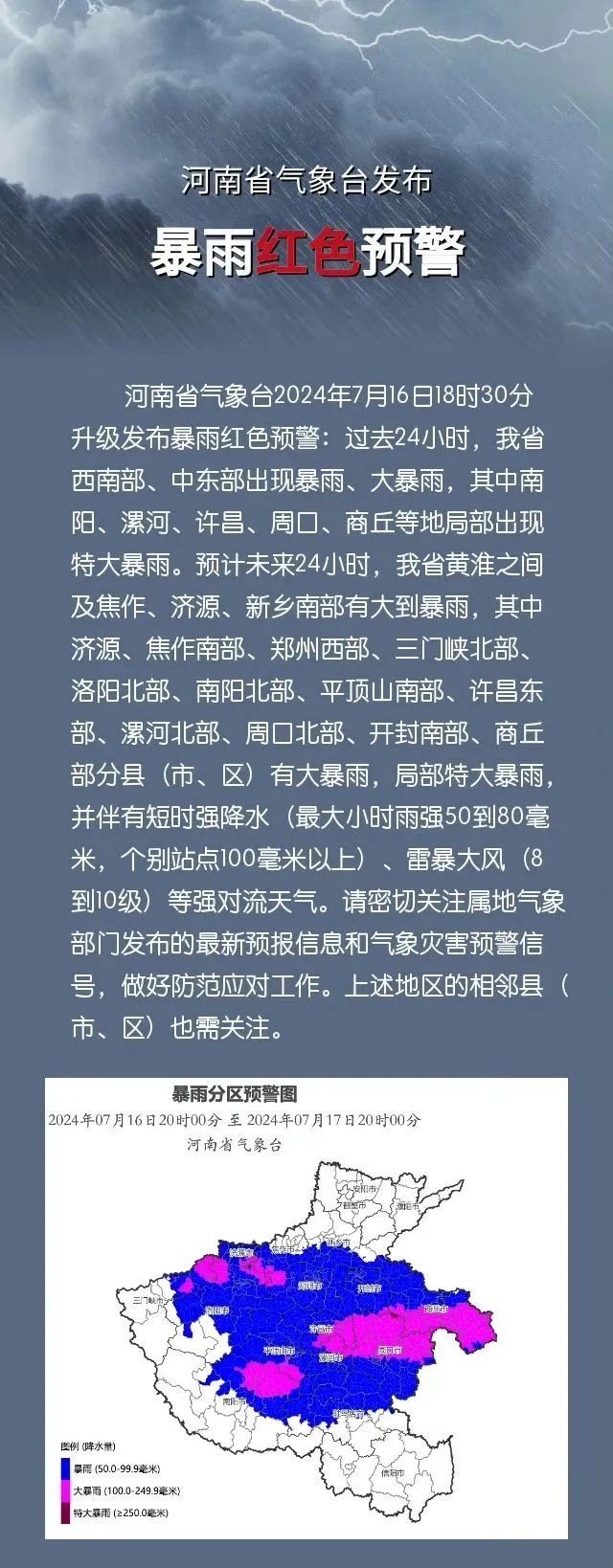 河南省气象台7月16日18时30分升级发布暴雨红色预警。受河南降雨影响,7月17日北京西站部分列车停运。