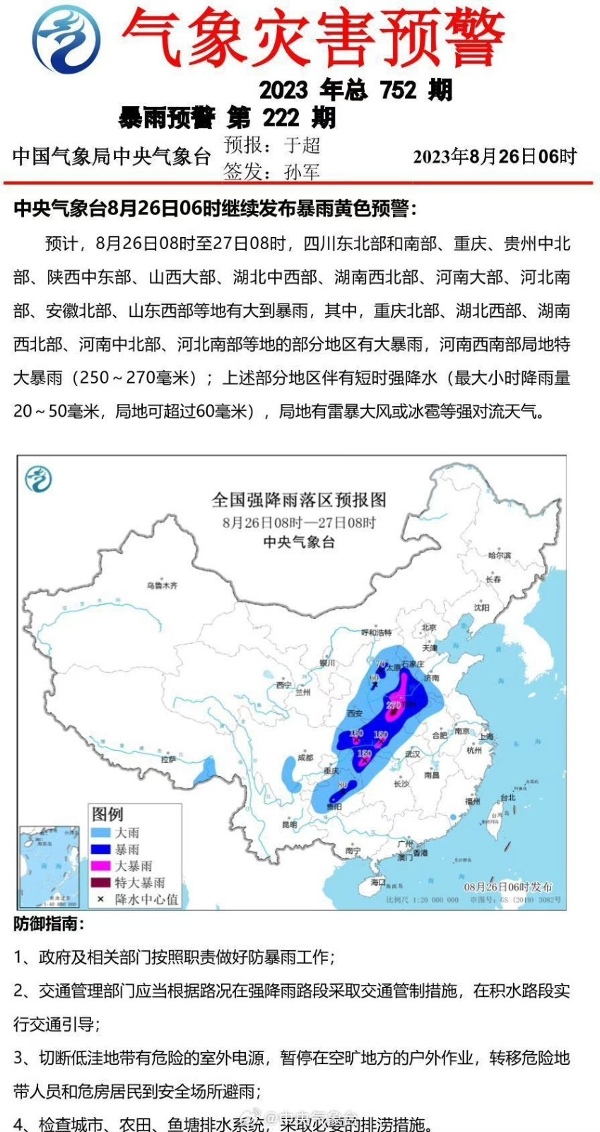 【中央气象台8月26日06时继续发布暴雨黄色预警】