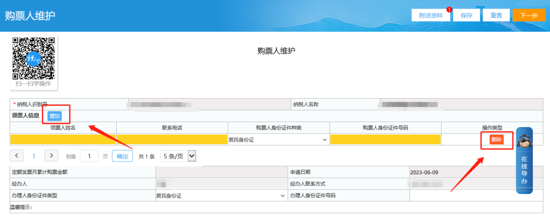 三、领购人维护页面,进入操作界面后,若要新增人员直接在此处点击增加;若要删除,可以在相关人员信息后方点击【删除】。