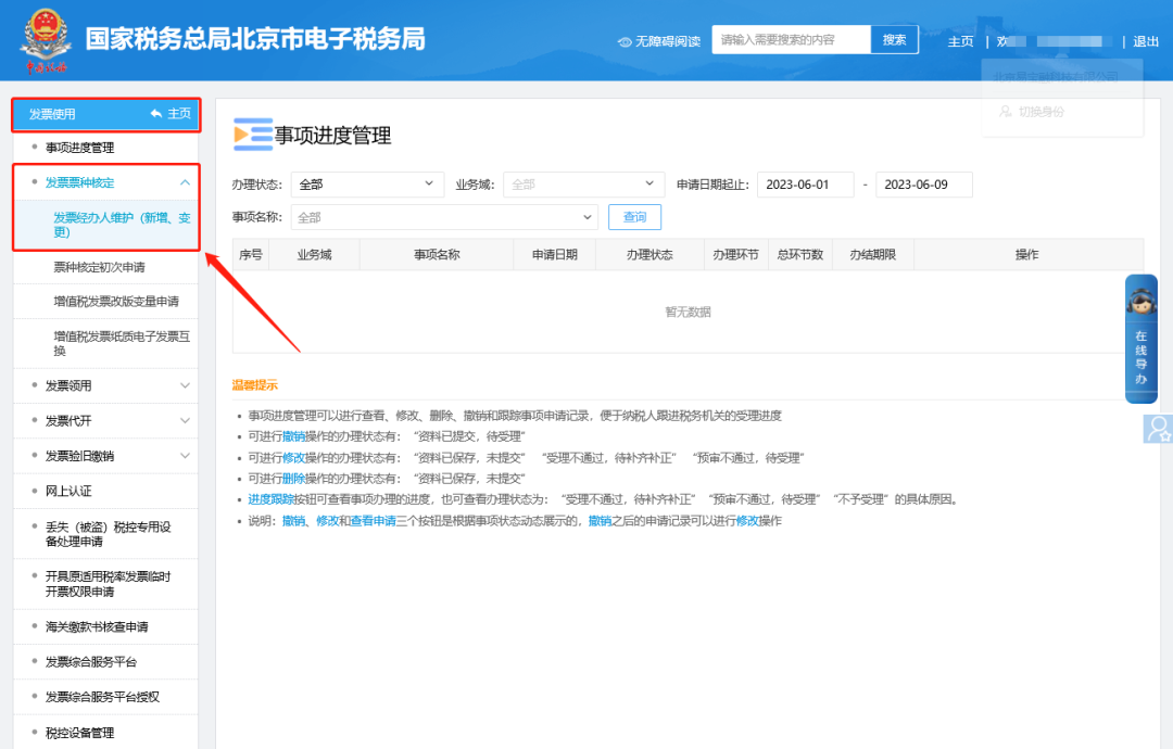 二、发票使用—发票票种核定—发票经办人维护(新增、变更)。