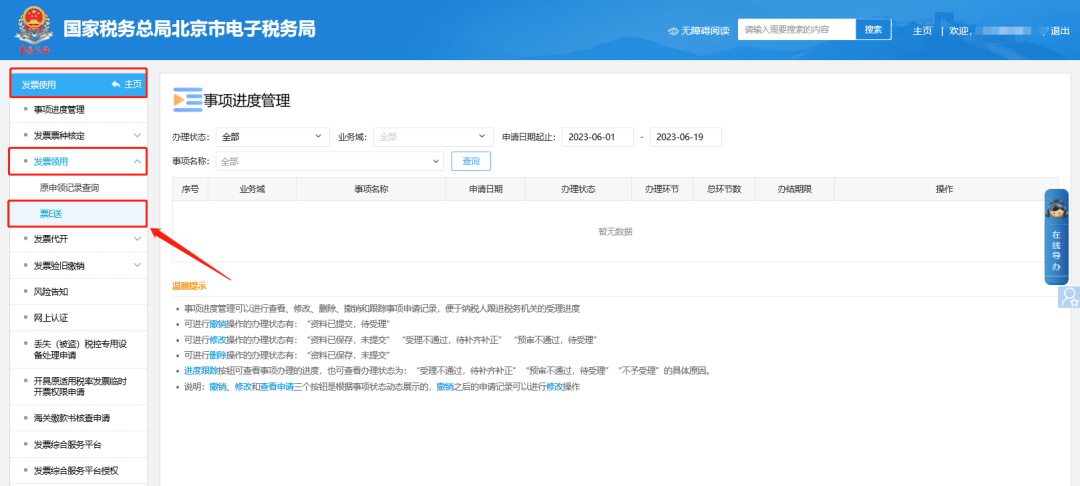 三、票E送页面,点击“新增”按钮,填好信息保存、提交。如申领的纸质发票,等状态变成配送中,右侧操作栏中会出现“打印发票收票单”,打印盖章给快递员即可。若申领电子发票,提交成功后,请您点击票E送模块中的“结存信息查询”,结存中有新申领的电子发票号段说明申领成功。