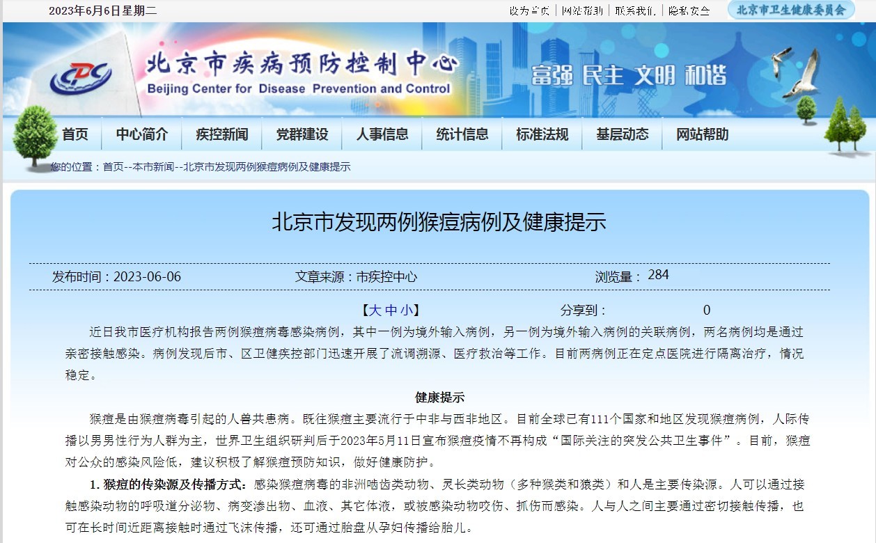 近日北京市医疗机构报告两例猴痘病毒感染病例,其中一例为境外输入病例,另一例为境外输入病例的关联病例,两名病例均是通过亲密接触感染。病例发现后市、区卫健疾控部门迅速开展了流调溯源、医疗救治等工作。目前两病例正在定点医院进行隔离治疗,情况稳定。