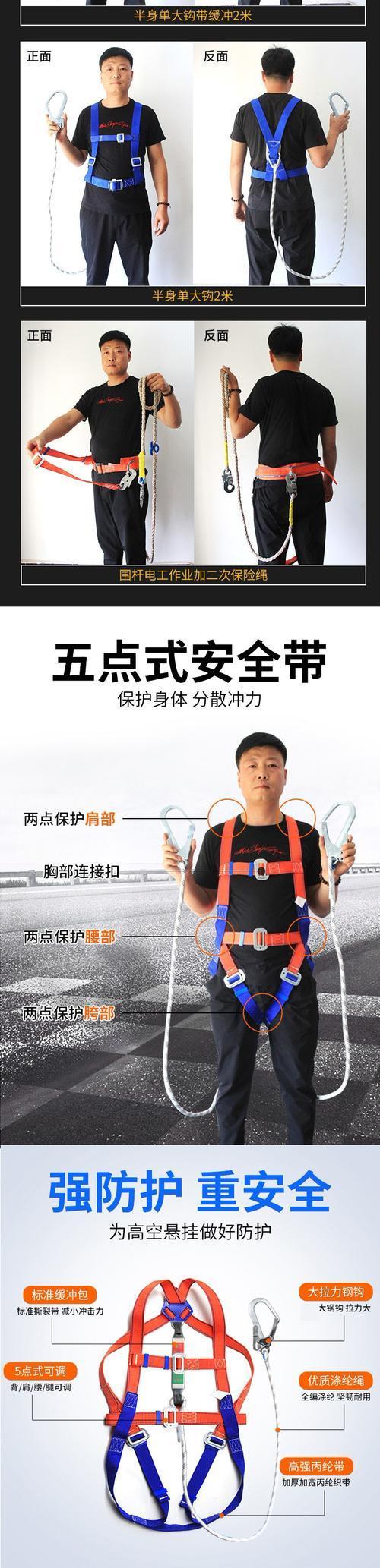 目前,五点式安全带被广泛应用于高空施工作业中。较之三点式安全带,五点式安全带能够在五个方向同时消散撞击提拉所产生的力量,对人体形成更多的保护。