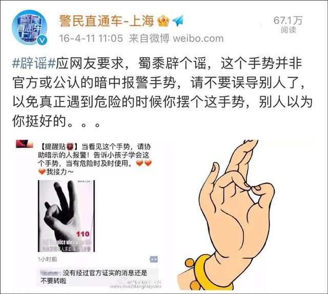 看到这么多博主在做报警手势的“科普”,一些人难免信以为真。到底真相如何呢?警方的态度很明确,那些所谓的“国际通用报警求助手势(或者姿势)”全是虚构的。事实上,上海网警、徐州网警、兰州网警等各地公安机关,自2016年以来已多次对此事辟谣,并称“不为大众所知的报警方式,只会害人!”警方给出的报警方式很简单,那就是拨打110;如果当事人不便发声,也可发送短信到12110。