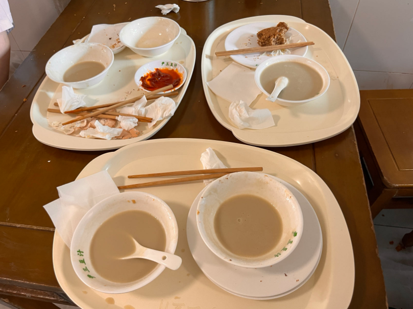 喝不完的情况几乎在每家售卖豆汁儿的店铺都能遇到。记者在位于前门西大街的护国寺小吃看到,10桌客人,8桌点了豆汁儿,7桌没喝完,店内员工称尝两口就剩下的不在少数。在老磁器口豆汁天坛店,员工不断把客人喝剩的豆汁儿倒进垃圾桶,有的看起来压根儿没动过。