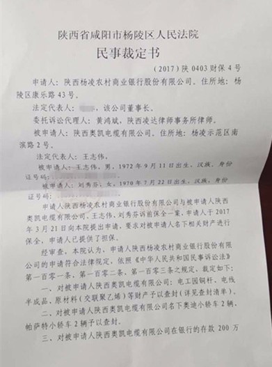 北京时间“此刻”(微信号:btimenow)掌握的一份《陕西省咸阳市杨凌区人民法院民事裁定书》显示,陕西杨凌农村商业银行股份有限公司(下称“杨凌农商行”)于3月21日向杨凌区人民法院提出申请,要求对陕西奥凯电缆名下相关财产进行保全。