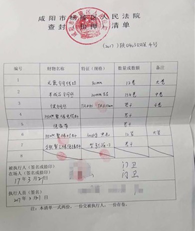 而杨凌区人民法院查封的清单中,在被执行人、在场人签名或捺印一栏,显示是由两位门卫签名并按手印。