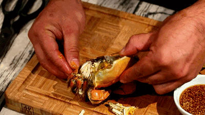 螃蟹处理:将螃蟹的钳子和腿按住,直接将螃蟹的后盖轻轻一拉直接打开,然后快速去掉4个不能吃的部位。