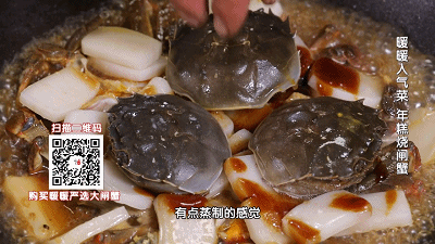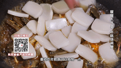 调味:加入2勺生抽酱油略烧,调大火,直接加入没过螃蟹一半的清水,直接加入切片的年糕。