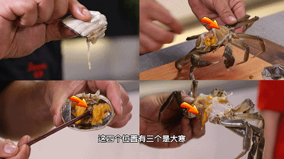 三角形的蟹胃:这个部位比较好辨认,呈三角形,蟹胃内有未消化的食物残渣、泥沙、细菌等,也是绝对不能吃的部位。