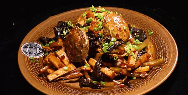 - 5 -次放入辅料藕条、青笋条、木耳,翻炒均匀,稍加浸煮。藕可以解除香辣蟹的油腻