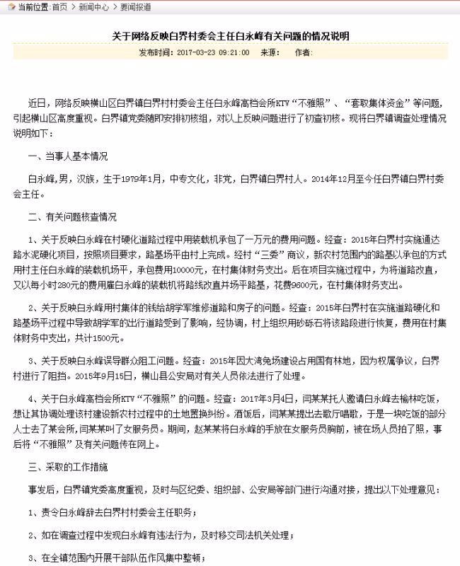 榆林市横山区委宣传部主办的横山新闻网23日上午发布一份《关于网络反映白界村委会主任白永峰有关问题的情况说明》称,关于白永峰高档会所KTV“不雅照”的问题。经查,2017年3月4日,闫某某托人邀请白永峰去榆林吃饭,想让其协调处理该村建设新农村过程中的土地置换纠纷。酒饭后,闫某某提出去歌厅唱歌,于是一块吃饭的部分人士去了某会所,闫某某叫了女服务员。期间,赵某某将白永峰的手放在女服务员胸前,被在场人员拍了照,事后将“不雅照”及有关问题传在网上。