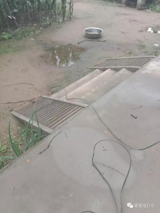 ▲2018年7月12日,案发后第二天,小雨老家庭院门前水洼中仍有血迹。 受访者供图