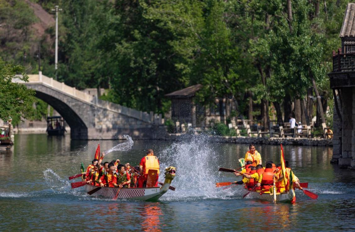 游客可观赏古风历史舞台剧——《屈原》,该剧结合甲胄与舞蹈,围绕屈原的形象营造出礼崩乐坏的动荡时代景象,展现屈原作为千古文人的家国情怀;也可欣赏穿行于汤河之上的国风花船巡游表演,感受国风之韵;还可观看紧张的龙舟拔河赛,感受团结向上的精神和氛围。景区内还有端午限定自助餐和五黄宴套餐供游客品尝。