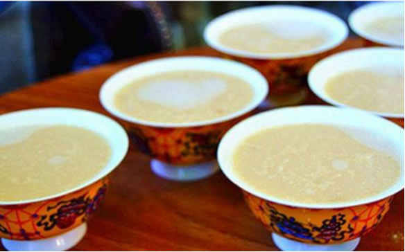 人们说,没有喝过酥油茶,就算没有到过青藏高原。初喝酥油茶,第一口异味难耐,第二口淳香流芳,第三口永世不忘。千百年来,在与严酷的自然条件作斗争时,藏族人民创造了酥油茶文化。酥油是从牛奶羊奶中提取的油脂,跟黄油有点相似,藏族人最喜欢用牦牛奶制作的酥油。酥油的制作过程大概是这样的:把鲜奶倒入木桶中,使其微微发酵,然后用专用的工具反复搅拌,搅拌上千次后,油水就会上下分离。这个时候要小心翼翼的把上层漂浮的油捞出来,放在凉水里,双手反复揉捏,直到杂质清除干净,就变成了纯正的酥油。制作酥油茶的时候,先把酥油放在桶中,加少许食盐,倒入浓茶,然后反复搅拌,直到茶和酥油充分融合,变成乳状就可以了。酥油茶有点像咱们常喝的奶茶,只不过奶茶也是牛奶加茶,而酥油茶是酥油加茶。在西藏,围绕酥油茶文化,还有茶会,贯穿于交友、节庆、离别、爱情等聚会中。
