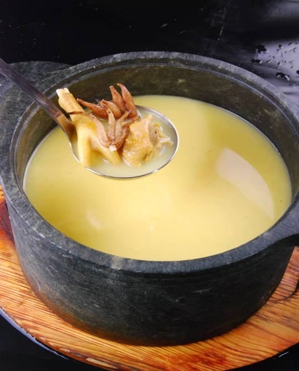墨脱意为“隐秘的莲花圣地”,坐落于西藏林芝市境内的雅鲁藏布大峡谷深处,千百年来当地人用他们勤劳的双手,以石为锅,烹煮食物,容器、炊具、汤勺都就地取材,将自给自足的自然经济发挥到了极致。这道“石锅松茸炖藏鸡”就是用历史悠久、质地绵软的墨脱石锅为器皿,以松茸菌融入小火慢炖3小时的藏土鸡汤中,汤鲜味美,味道醇厚。