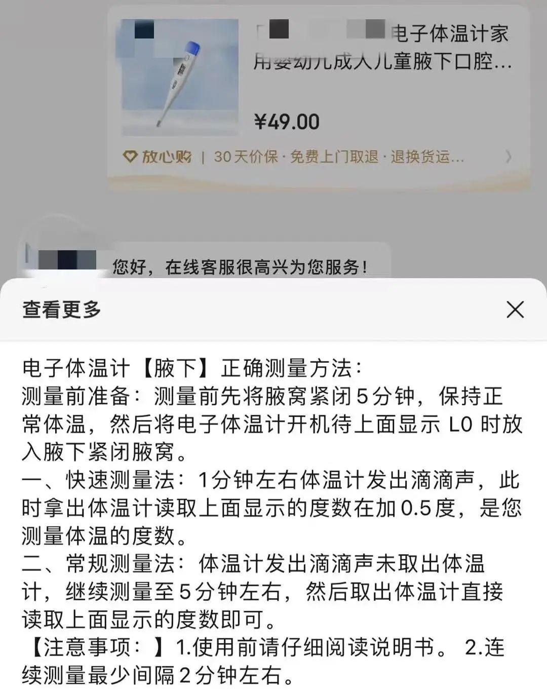 市民王先生则是自己在网上购买了电子体温计,当发现测出来的温度偏低后询问客服,客服提示他要注意使用方法。