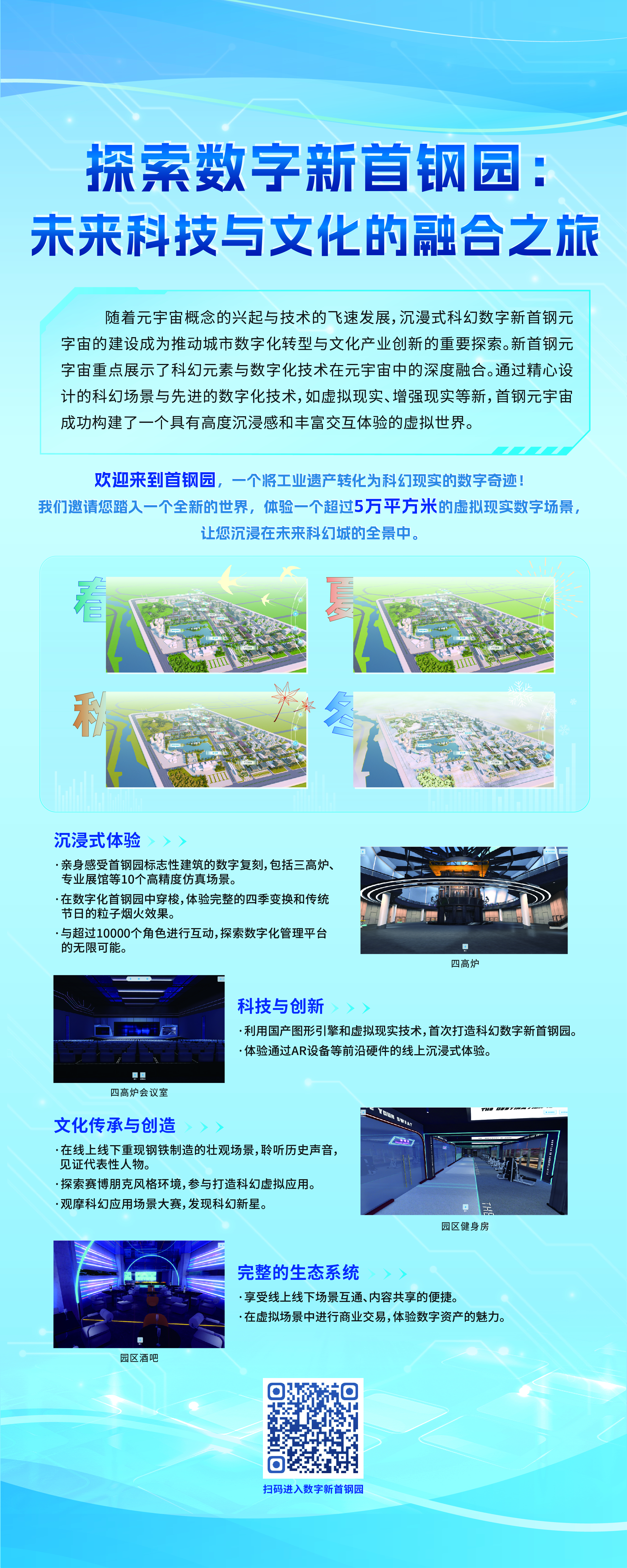 在国家大力推动数字经济和科技创新的政策背景下,作为北京市工业遗产保护和数字化创新的重要标杆,首钢园区迎来了重要的数字化转型。基于首钢园现有数字资产基础,利用最先进的虚拟现实技术,构建一个全景式沉浸式数字仿真体验地,进而打造“数字新首钢园”。