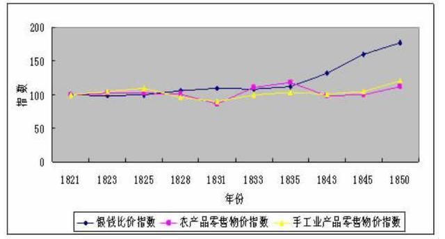 在1835-1845年间,农产品和手工产品的价格在下跌或者不涨,而银钱比例却在疯涨,15年间涨了快1倍,民间多用铜钱,而官府只要白银,兑换之间,无疑就是复旦增加了不止一倍。