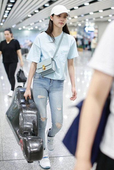 北京,欧阳娜娜现身机场,T恤配牛仔休闲风秀大长腿,过声控门高举双臂放飞自我,独自抱巨大琴箱显吃力。金投奢侈品网(http://lux.