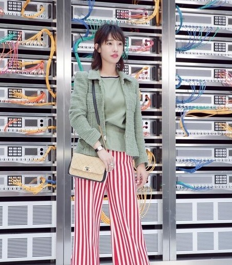 白百合一身粉绿色上身套装搭配红白条纹阔脚裤,复古时尚,大秀长腿,并且粉色系还能衬托肌肤白嫩,时尚复古女王非你莫属。