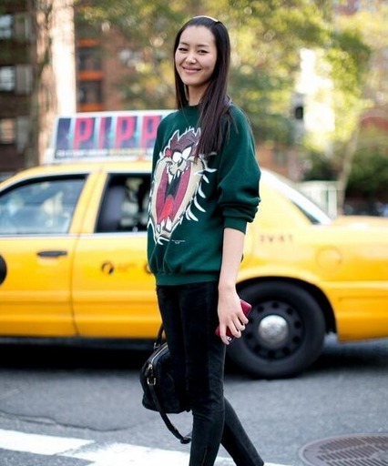冬天必不可少的卫衣,在搭配上大可做文章,能大玩五彩缤纷的颜色色彩,简简单单的搭配一条黑色长裤就能轻轻松松的出门了,刘雯这身绿色卫衣搭配可算是时尚减龄,休闲可爱。