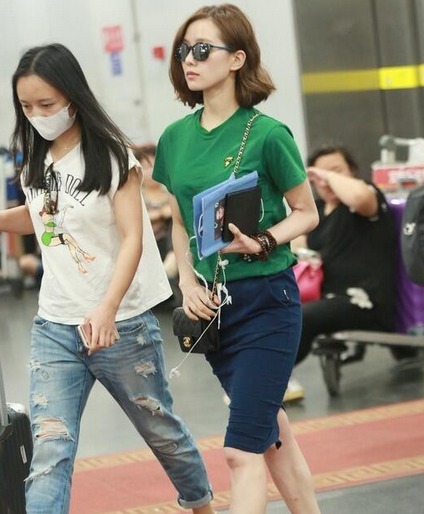 刘诗诗以绿色T恤搭配深蓝色半身裙,大玩撞色搭配技巧,清新休闲,随性自然。