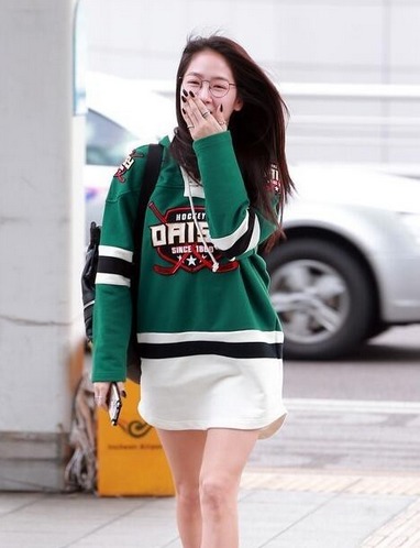 Sistar成员昭宥一身绿色长款卫衣搭配运动帆布鞋现身机场,青春活力,时尚减龄,ONE PIECE穿法懒人最爱,简单方便又时尚。