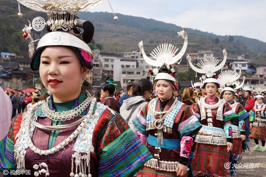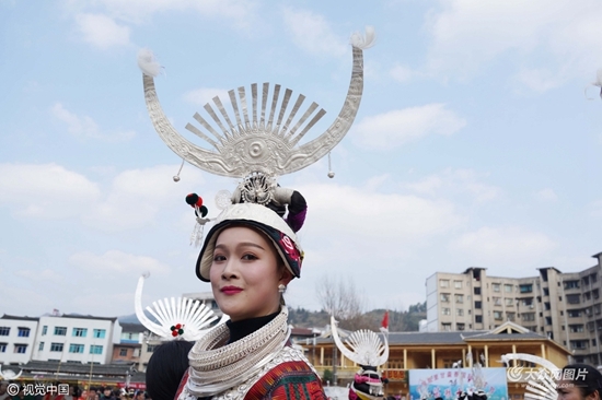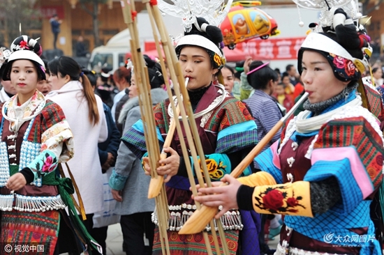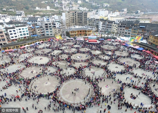2017年2月16日,贵州省黔东南苗族侗族自治州,凯里市舟溪镇,苗族同胞汇聚一堂跳芦笙舞,数干支芦笙在几十个圆圈中共呜,震撼山岳,不少游客感慨地说,这是世界上最强音民间芦笙舞。(图文来源:视觉中国,图片/吴东俊)