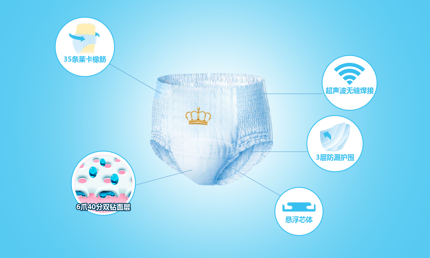 面层采用压花及打孔双项专利技术,拒绝传统的热熔胶粘合方式,不仅有效提升了尿裤的柔软度,也增加了尿裤的透气性;