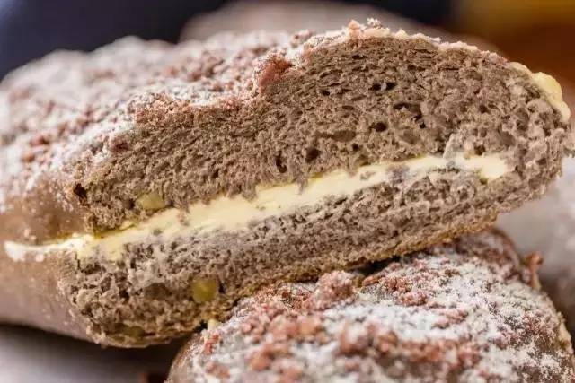 一口就可以吃到紫薯红薯奶酪和面包,外皮Q弹而有嚼劲。身边有人说过它的内馅吃起来好像有QQ糖的感觉~