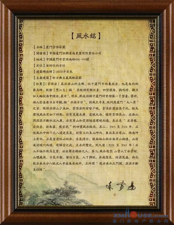云顶庄园背靠厦门之巅云顶岩,山脉从云中发来,前有宝袋湖,一面阔海环绕,观澜厦门东南黄金海岸与金门诸岛,藏风聚气,蓄气合一。将"龙、砂、水、穴"的吉祥风水元素集于一身,天赋贵人位,地设化煞型,利贵人修身养性也。