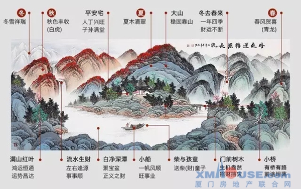 正如中国山水画院专业画家--吴大恺这幅《时来运转源长流》山水画,山围四面,水绕三方,从风水学的角度来看,好风水的第一大原则是"山环水抱",背后有山作依靠,来旺人,前面有水来环绕,来旺财。
