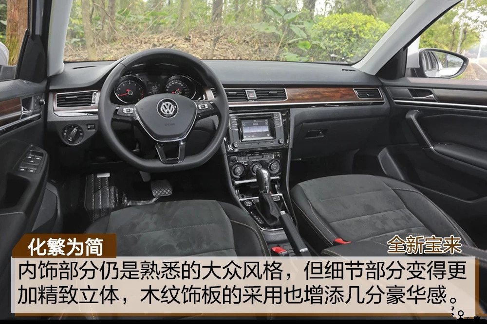 内饰方面, 新宝来采用双炮筒设计仪表台,带白色背光,立体感陡增,信息屏幕可以显示行驶里程、瞬时及平均车速、瞬时及平均油耗、行驶时间、续驶里程等及各种报警信 息;而中控台从音响控制区域到换挡区域一气呵成。新宝来在老款车型基础上对部分车款配置进行升级,其中1.6L时尚型增加真皮方向盘和电加热外后视 镜;1.6L和1.4T舒适型增配了迎宾踏板、胎压监测、副驾驶席安全带未系提醒功能;1.6L和1.4T豪华型则增加无钥匙进入和启动、电动折叠外后视 镜(带倒车自动调节功能)