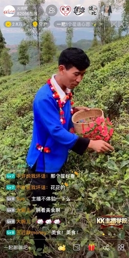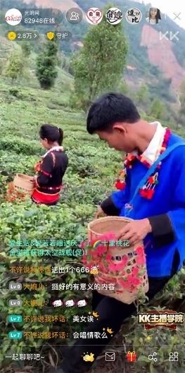 德昂族民间神话史诗《达古达楞格莱标》称,“德昂族是茶叶变的,茶是德昂族的根”,德昂族也被称为是最古老的茶农。赵腊退在直播间向观众介绍了德昂族特有的酸茶,还分别讲述了提亲茶、请柬茶的不同包装方法和代表的不同含义。赵腊退还带着KK直播的观众走进山中茶园,体验山间采茶,山间天气变化迅速,时晴时雨,蒙蒙细雨中的采茶姑娘更是让直播间的观众感受到茶山的浪漫气息。