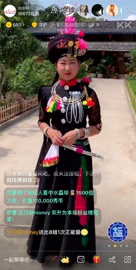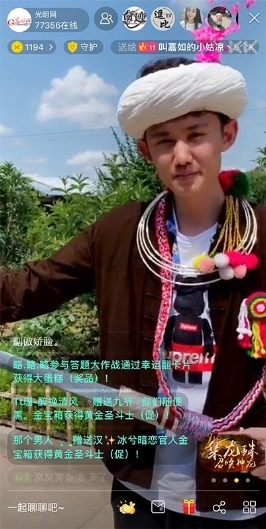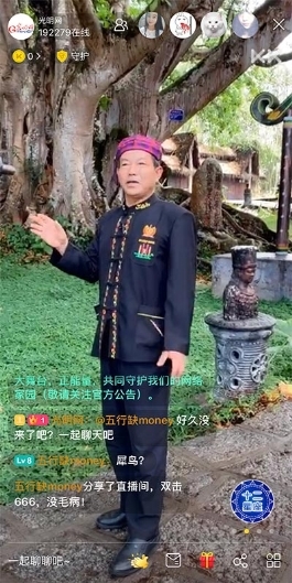 在云南德宏陇川云南景颇园,国家级非遗保护名录《景颇族目瑙纵歌》国家级代表性传承人赵宝忠,与主播一起向观众展示景颇族的特色风情。