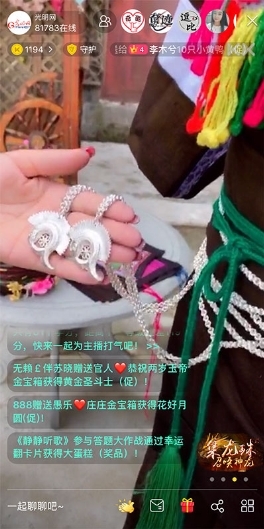 2006 年户撒刀锻制技艺被列入第一批国家级非物质文化遗产名录,阿昌族打刀世家嫡系传人项老赛,被列为国家级非物质文化传承艺人。主播的身佩戴的一把银光闪闪的精致户撒刀,就是出自项老赛之手。与主播同行的阿昌族姑娘身上则佩戴着一把小巧精致的小银刀。