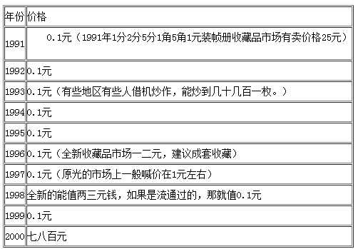 1991年的一角硬币,材质是铝镁合金的比较多见,而且正在流通之中,一般情况下按照面值计算,就是1角换1角,有的地方比较少见,那是因为投放量不均造成的,收藏价值也不高。具体的价值还得问中国人民银行或者收藏家。集齐1991年1分2分5分1角5角1元价值就大些。1991年1分2分5分1角5角1元装帧册收藏品市场有卖价格25元。