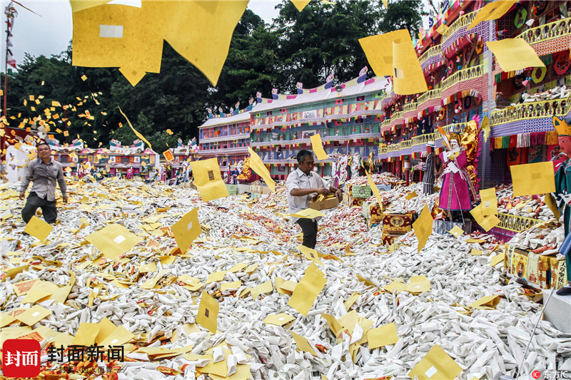 当地时间2017年9月5日,印度尼西亚棉兰,为纪念中元节(鬼节),印尼华人烧香、抛撒"冥币"、摆放祭品,悼念祖先、告慰亡灵。
